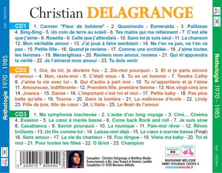 ACTUALITESANTHOLOGIE 1970-1985 CHEZ MARIANNE MELODIEUn nouvel album qui devrait vous séduire : le plein dechansons jamais sorties sur CD que nous avons re-masterisées, où vous retrouverez, après avoir emprunté lamachine à remonter le temps, les sons d'origines, commesi vous étiez avec moi dans ces studios d'enregistrement... Vous voyagerez de 1970 à 1985, à travers trois CDs quireprennent intégralement tous les titres que j'ai puenregistrer en 15 ans : les tubes que vous avez adorés,des titres de faces B qui n'ont rien perdu de leur charme,mais encore mieux : des chansons inédites qui, commedes perles rares, étaient restées au chaud d'un coffre-fortet que Matthieu Moulin, de Marianne Mélodie, a retrouvé àforce de recherches dans les différentes maisons dedisques : vous serez les premiers à les entendre !COMMANDERNOUVEL ALBUM “...Et je t’aime” disponible fin octobre 2025«...Et je t’aime »EST LE NOUVEL ALBUM DE CHRISTIAN DELAGRANGEC’est avec une grande émotion que je vous annonce la sortie, fin octobre, de mon nouvel album intitulé « …Et je t’aime ».Un opus de 15 nouvelles chansons, écrites et composées comme les pages d’un journal intime. Il y sera question d’amour, de rêves, de blessures, de renaissances tel un hymne à la vie…Une chanson est également dédiée à nos compagnons à quatre pattes qui ont partagé notre route et qui, un jour, nous ont quittés. Parce que cette douleur-là, nous la connaissons tous, ils méritent aussi cette mise à l’honneur, ce cri d’amour. À travers ces mélodies, j’ai voulu créer un miroir dans lequel chacun peut se reconnaître, retrouver un souvenir, une émotion, une parcelle de lui-même. Cet album, c’est un voyage intime, une déclaration, un aveu, à ceux qui nous accompagnent, à ceux qui continuent de vivre dans nos cœurs.Chaque morceau est une histoire, un instant de vérité, une déclaration d’amour à la vie et aux rencontres qui la jalonnent, qui la façonnent. C’est une façon de dire « merci », et surtout de répéter ces trois mots simples mais essentiels : « …Et je t’aime ».J’ai hâte de vous le faire découvrir, de partager ces nouvelles mélodies avec vous, et de les voir résonner dans vos cœurs comme elles résonnent dans le mien.Il sera disponible d’ici 3 à 4 semaines dans les spectacles, mais également en ligne sur Amazon.DVD 50 ANS DE CARRIÈRE A L’ALHAMBRA50 ans de partage avec son public, célébrés lors d’un concertexceptionnel à L’Alhambra ! Un magnifique spectacle reprenant les plus grands succès de sacarrière !COMMANDER